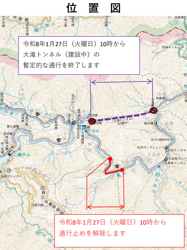 通行止め解除に伴い、大滝トンネルの暫定的な通行は終了します。
