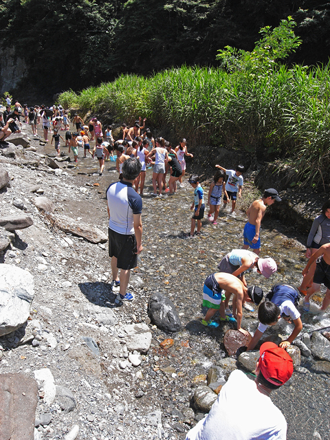 浅瀬にマスを放流し、みんなでつかみ捕り!